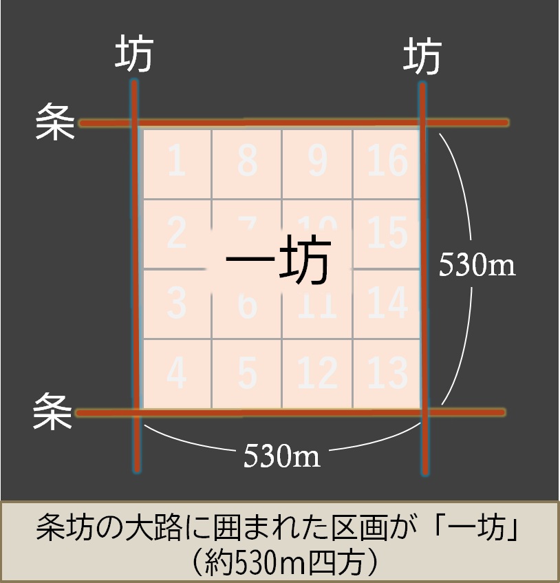 町並みは、碁盤の目のように東西に「条」、南北に「坊」と呼ばれる道が敷かれ、整然と区画されました。