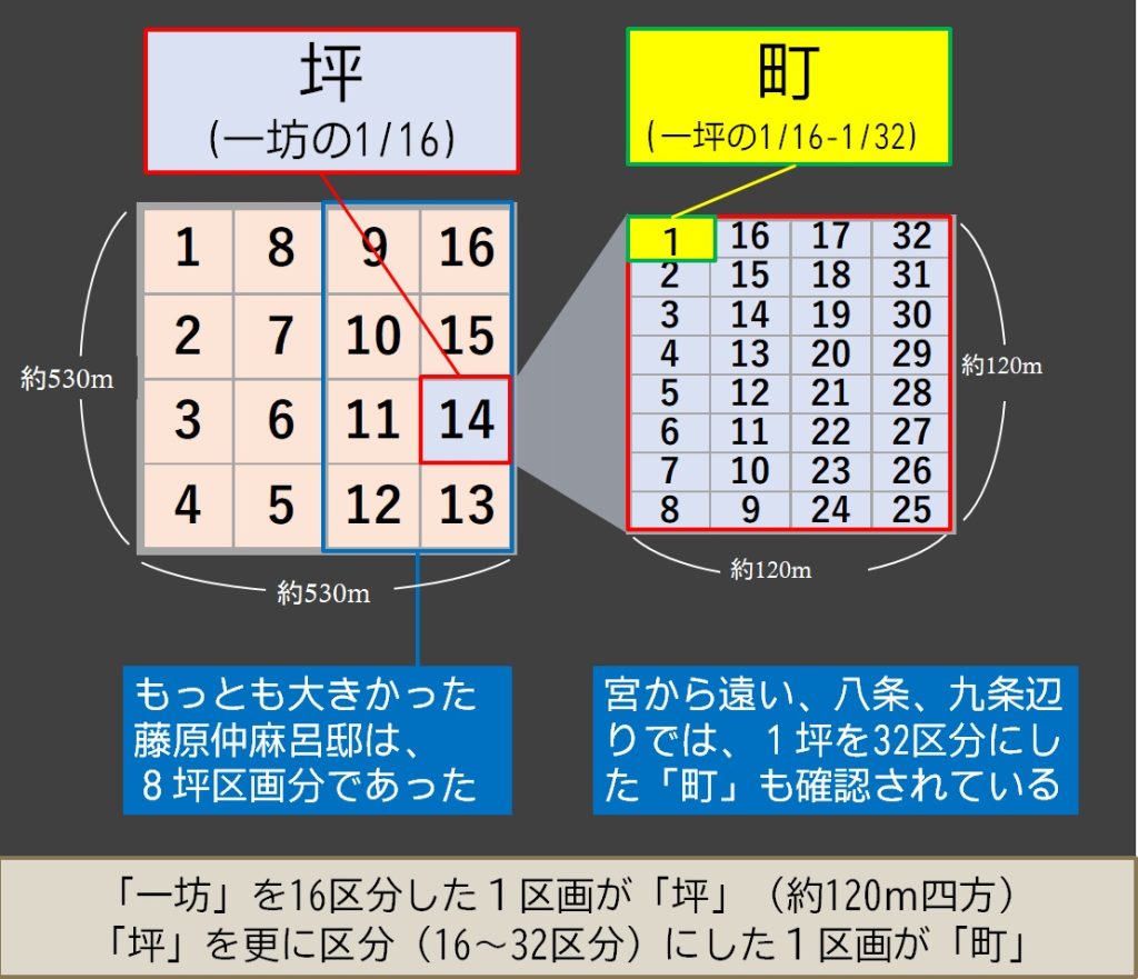 さらに、「坪」を 16分割(宮から遠い八条、九条辺りでは32分割)された区画が「町」と呼ばれ、居住地として割り当てられました。