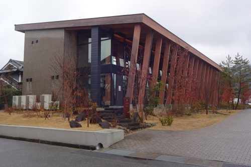 道沿いに建つガラス張りの建物の1階部分がレストランとショップになっています。